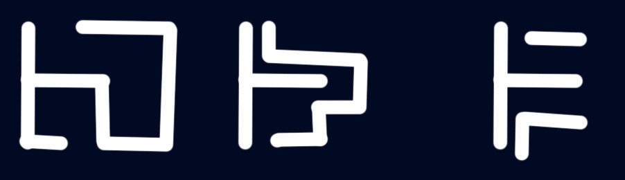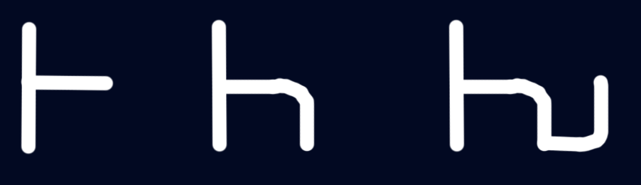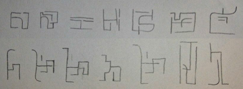 Criterium 3b: Because we like artistic expression, criterium 3a does not quite give us enough distinct options. So we add that: If you take a valid rune and replace two straight (or only consisting of right angles) floaties with a floatie that contains one 90° curve, it still corresponds to the same latin letter.